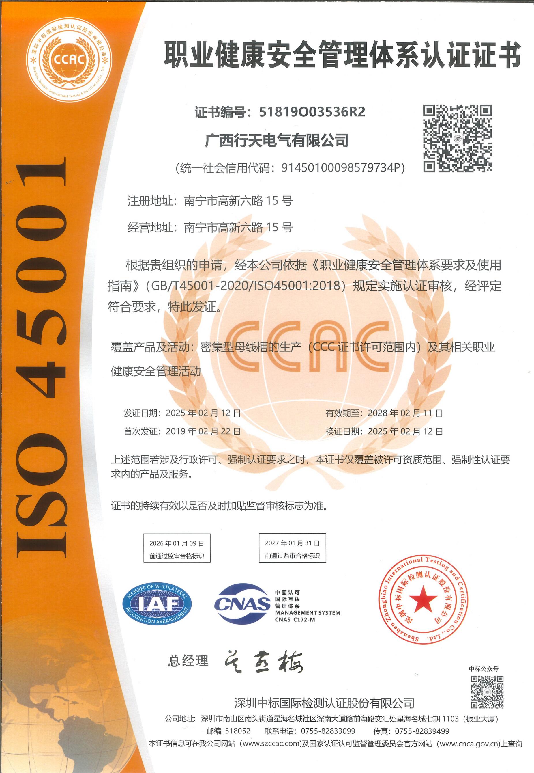 职业健康安全管理体系认证证书-
